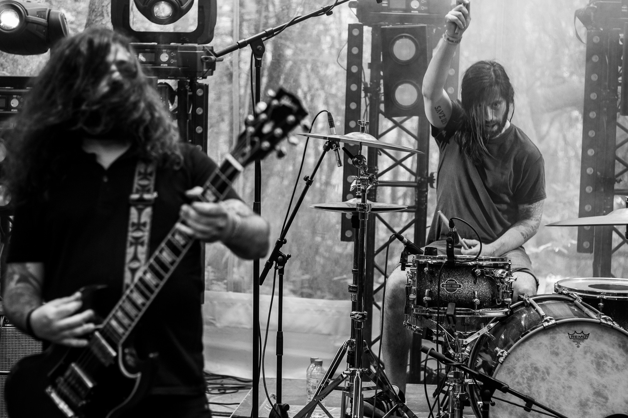 À peine le temps de souffler qu’on doit déjà repartir en direction de la Forest Stage où Malämmar est en train de s’installer. Derniers réglages avant le début du concert et préparation d’un stock impressionnant de cannettes de Primus, alignées le long des retours. On se demande comment ils vont faire pour boire tout ça ! Ce n’est que quelques minutes plus tard, avant le début du set, que l’on comprend que ces bières nous sont en fait destinées. Au départ distribuées une par une dans le public par le bassiste, les petites boîtes métalliques sont finalement envoyées dans les airs depuis la scène et rattrapées à la volée par les festivaliers les plus agiles. Heureusement que personne ne s’en est pris une en pleine figure parce que ça doit faire mal… Par chance, on a reçu la nôtre au début de la distribution et peut tranquillement la siroter en se laissant enivrer par les roulements de batterie puissants, les basses lourdes et les riffs massifs des Barcelonais. Avec son post-metal sludge, le trio espagnol réveille les âmes endormies de la forêt. On est conquis.