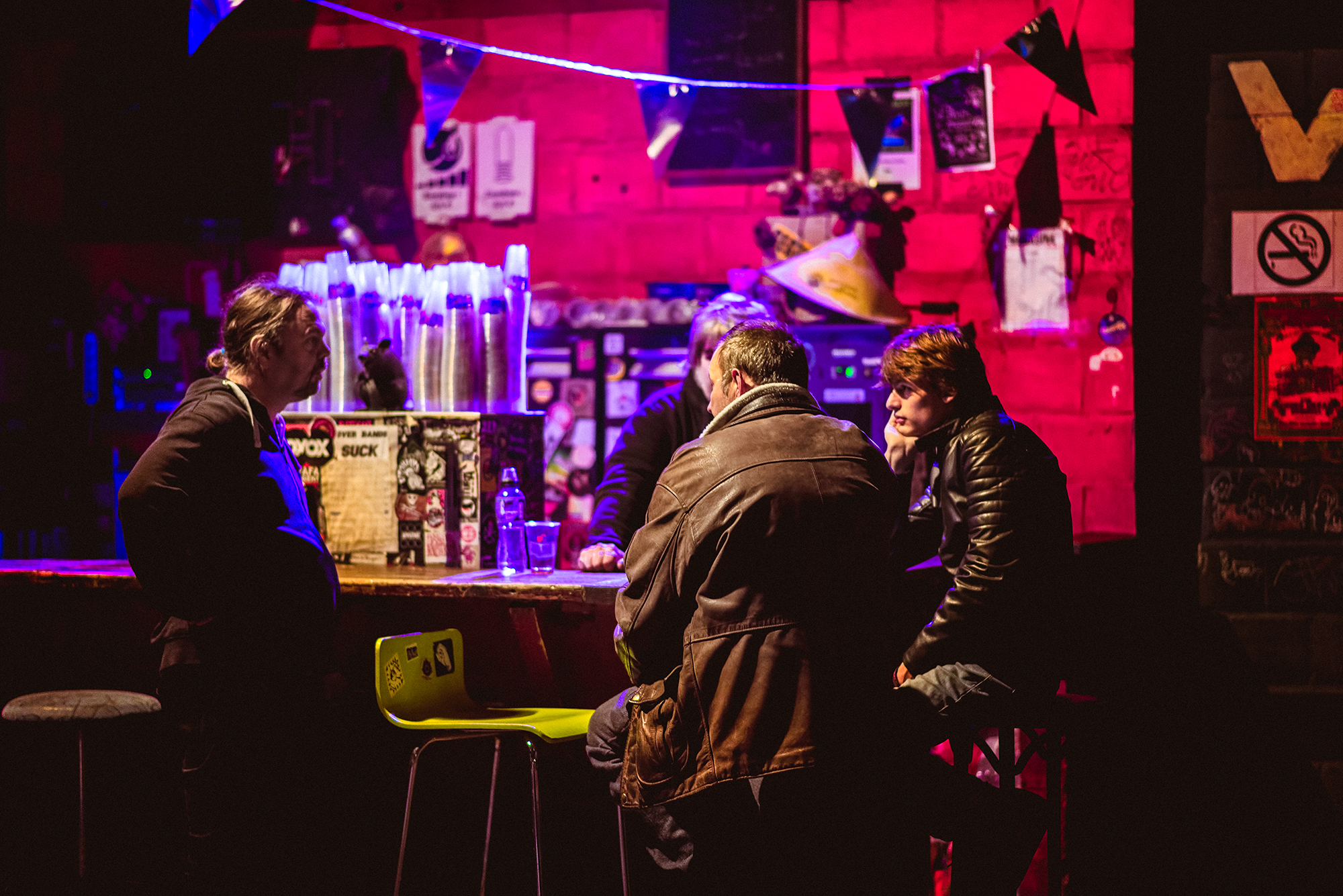 Ça change tout le temps ! Parce que le principe c‘est qu’on est tous bénévoles et qu’on apporte ce qu’on peut apporter quand on peut l’apporter. On est quatre administrateurs mais il y a d’autres personnes qui ont des rôles très importants dans l’asbl. Ici, il n’y a pas de hiérarchie donc si des membres de l’équipe veulent faire quelque chose, ils nous préviennent mais s’arrangent entre eux pour le son, les lights, l’achat de matériel… On les laisse aussi prendre des initiatives. C’est, par exemple, le cas de la distro qui rassemble tous les disques des groupes qui ont joué au Magasin 4. On a une réunion de bénévoles tous les mois pour coordonner tout ça. Pour répondre à ta question, je dirais que pour une soirée il faut à peu près compter 15 bénévoles. Il y a en a qui sont là durant plusieurs années puis qui disparaissent et reviennent, d’autres qui sont là tout le temps. À l’heure actuelle, on est environ 80 bénévoles en tout.